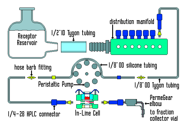 All PermeGear automated diffusion cell systems are based on the continuous flow principle. A multi-channel peristaltic pump draws receptor solution from a reservoir through a distribution manifold and sends it to the In-Line Cells. The cells are warmed to 35?-37?C by a heater/circulator that pumps water through the Cell Warmer in which the In-Line Cells are located. After filling the receptor chambers of the cells and purging the system of bubbles, the subject compound is then placed in the donor chambers of the cells. From that time, the fluid is collected in the vials of the fraction collector at user set time intervals. The vials are taken for analysis manually after the sampling time has elapsed.