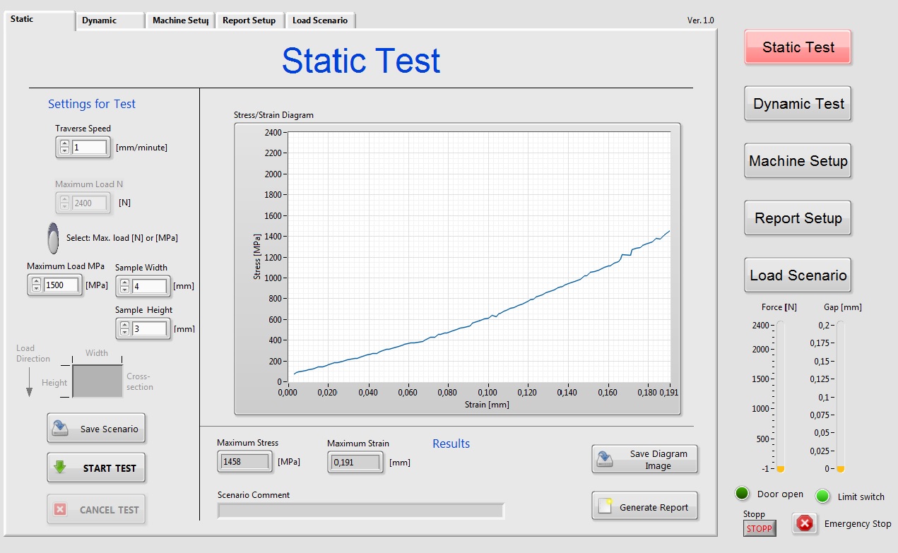 The system is particularly expedient for the testing of zirconium oxide and all ceramic materials. A special testing process allows users to conduct serial testing at breathtaking speeds. Implant testing according ISO 14801 is also possible.