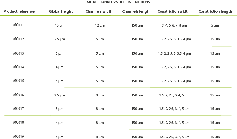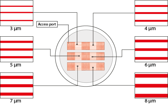 施加到您的细胞的3D形状和应力条件取决于微通道的大小。每个芯片具有6个微通道范围和9个访问端口。
