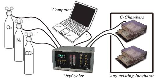 1. 整套系统由立的高级气体控制器、细胞培养C-chamber组成,连接电脑通过软件控制气体浓度曲线。