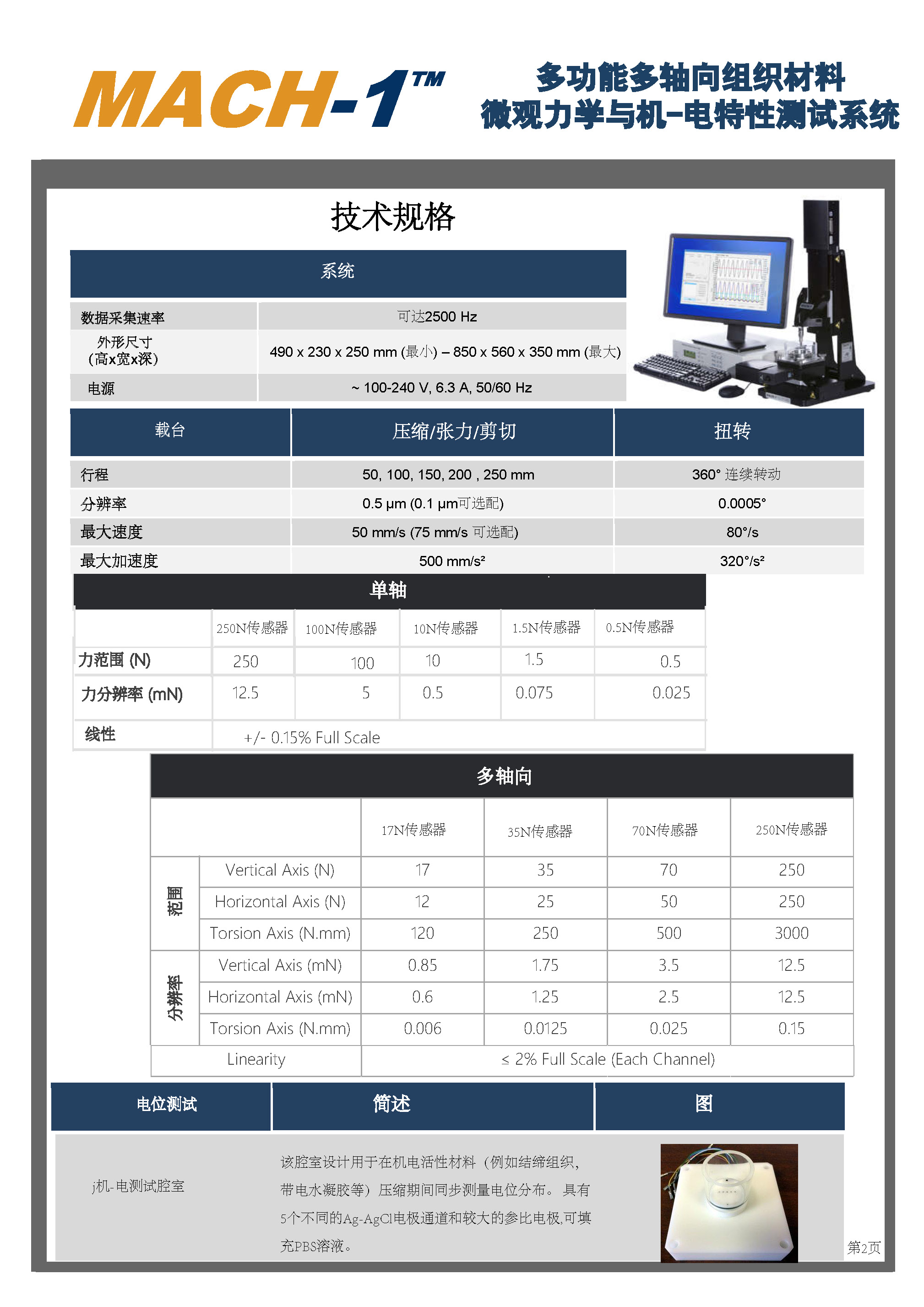 该系统是能集成模块化压缩、张力、剪切、摩擦、扭转和2D/3D压痕、3D轮廓及多力混合耦连测试的一体化微观力学测试装置。能对生物组织、聚合物、凝胶、生物材料、胶囊、粘合剂和食品进行精密可靠的机械刺激和表征。允许表征的机械性能包括刚度、强度、模量、粘弹性、塑性、硬度、附着力、肿胀和松弛位移控制运动。