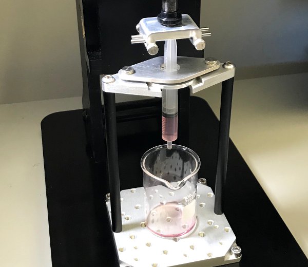 This holder is designed to be compatible with syringes of various sizes. 3 pairs of perforated disks are provided to be placed on top of the holder allow switching between syringes of different sizes. A beaker is normally placed between the posts to contain the expulsed substance. A flexible tube can be attached between the tip of the syringe and the beaker of solution to minimize Archimedes' force. A special holder allows the syringe piston to be pushed or pulled by the vertical stage under the load cell to evaluate the performances of the assembly for a particular solution.