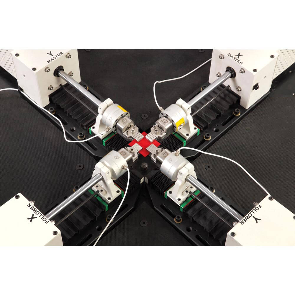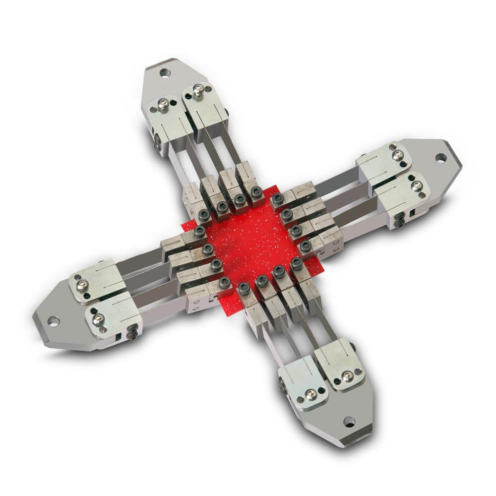 Planar biaxial testing poses a number of challenges in that the two axes of loading should be amenable to precise independent control in the desired mode (Stroke, Load or local (axial) strain response) and with desired distribution of load and phase lag between the two axes. Another challenge is to restrict loading to strictly biaxial, without any shear component whatsoever that may not only distort the desired stress state, but also threaten unintended damage to the specimen outside the gauge area.
