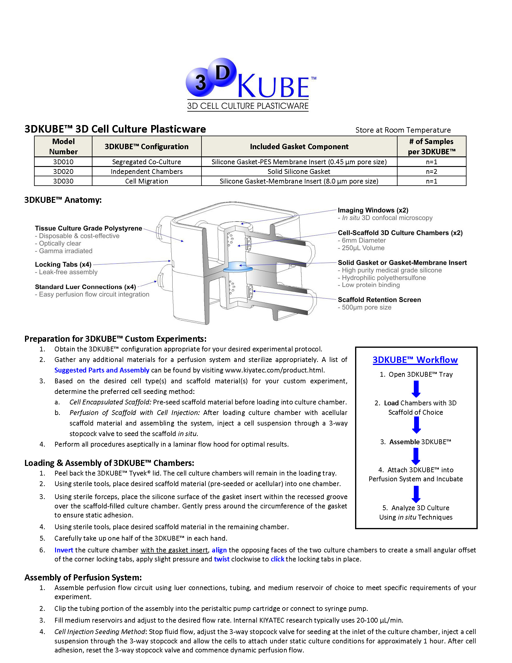 KIYATEC 3DKUBE?是一个小型动态3D细胞培养装置。该装置有两个腔室,从而可改装用于满足不同的实验需求,例如两腔室可单du用于不同条件下的培养,也可联合用于复杂的3D共培养。每个3D培养腔室容积为250 ?L,可容纳四块3D Insert?支架填充
