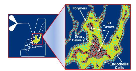 3D culture of endothelial cells and breast cancer cells were evaluated for their viability following treatment with chemotherapeutic drugs. SynTumor model demonstrated significant differences in drug responses under static conditions compared to perfusion and diffusion based modes of interaction commonly observed in vivo.