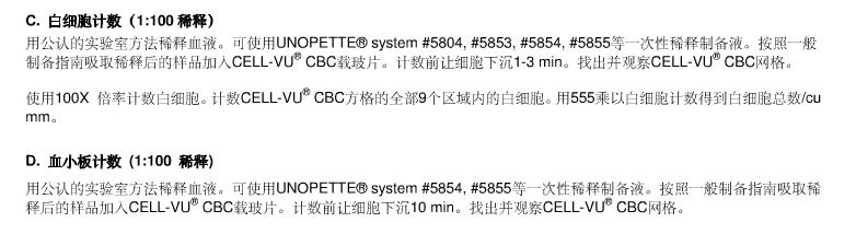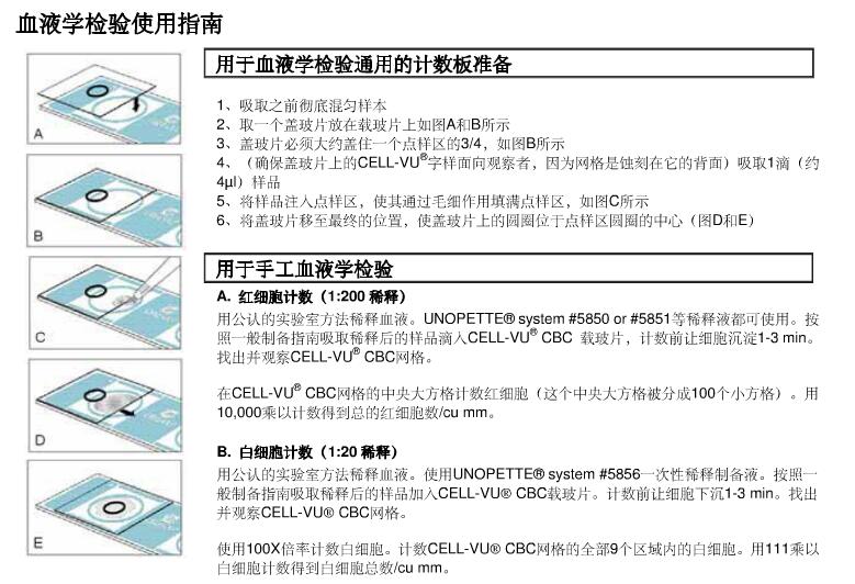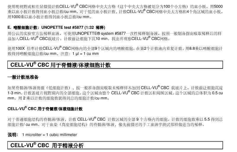 用于手工血液学检验 红细胞计数(1:200稀释) 用公认的实验室方法稀释血液。UNOPETTE® system #5850 or #5851等稀释液都可使用。按照一般制备指南吸取稀释后的样品滴入CELL-VU® CBC 载玻片,计数前让细胞沉淀1-3 min。找出并观察CELL-VU® CBC网格。 在CELL-VU® CBC网格的中央大方格计数红细胞(这个中央大方格被分成100个小方格)。用10,000乘以计数得到总的红细胞数/cu mm。 B. 白细胞计数(1:20稀释) 用公认的实验室方法稀释血液。使用UNOPETTE® system #5856一次性稀释制备液。按照一般制备指南吸取稀释后的样品加入CELL-VU® CBC载玻片。计数前让细胞沉淀1-3 min。找出并观察CELL-VU® CBC网格。 使用100X倍率计数白细胞。计数CELL-VU® CBC网格的部9个大方格内的白细胞。用111乘以白细胞计数得到白细胞总数/cu mm。 C. 白细胞计数(1:100稀释) 用公认的实验室方法稀释血液。可使用UNOPETTE® system #5804, #5853, #5854, #5855等一次性稀释制备液。按照一般制备指南吸取稀释后的样品加入CELL-VU® CBC载玻片。计数前让细胞沉淀1-3 min。找出并观察CELL-VU® CBC网格。 使用100X 倍率计数白细胞。计数CELL-VU® CBC网格的部9个大方格内的白细胞。用555乘以白细胞计数得到白细胞总数/cu mm。 D. 血小板计数 (1:100 稀释) 用公认的实验室方法稀释血液。可使用UNOPETTE® system #5854, #5855等一次性稀释制备液。按照一般制备指南吸取稀释后的样品加入CELL-VU® CBC载玻片。计数前让细胞沉淀10 min。找出并观察CELL-VU® CBC网格。 使用明视野或相差显微镜计数CELL-VU® CBC网格中央大方格(这个中央大方格被划分为100个小方格)的血小板。用5000乘以血小板计数得到血小板总数/cu mm。对于低的血小板计数,计数CELL-VU® CBC网格中央大方格和4个角方格的血小板。用1000乘以血小板计数得到血小板总数/cu mm。 E. 嗜酸细胞计数:UNOPETTE test #5877 (1:32 稀释) 用公认的实验室方法稀释血液。可使用UNOPETTE® system #5877一次性稀释制备液。按照一般制备指南吸取稀释后的样品加入CELL-VU® CBC载玻片。计数前让细胞沉淀10 min。找出并观察CELL-VU® CBC网格。 使用100X 倍率计数CELL-VU® CBC网格内的部9个大方格内的嗜酸细胞。在2个计数池内重复计数。用8.8乘以嗜酸细胞计数得到嗜酸细胞总数/cu mm。 注:1 ?l = 1 cu mm CELL-VU® CBC用于脊髓液/体液细胞计数 一般计数池准备 如果脊髓液/体液清澈(低细胞计数),按一般准备指南吸取未稀释样本加到CELL-VU® CBC载玻片上。计数前让细胞沉淀1-3 min。计数盖玻片视野圈内的部细胞。这个区域由整个CELL-VU® CBC计数区和周围区域。这个区域的总体积为0.5 cu mm。用2乘以计数的细胞数就得到总的细胞计数/cu mm。 CELL-VU® CBC用于脊髓液/体液细胞计数 对于普通细胞结构的脊髓液/体液,计数CELL-VU® CBC 网格的部9个方格内的细胞。计数的细胞数乘以5.5得到总细胞计数/ cu mm。对于血染(高度细胞结构)的脊髓液/体液,像先前描述的手工血液学测试那样做适当的稀释。 注:1 ?l = 1 cu mm CELL-VU®CBC 用于精液分析 |