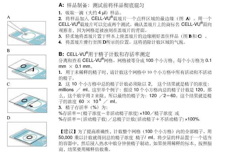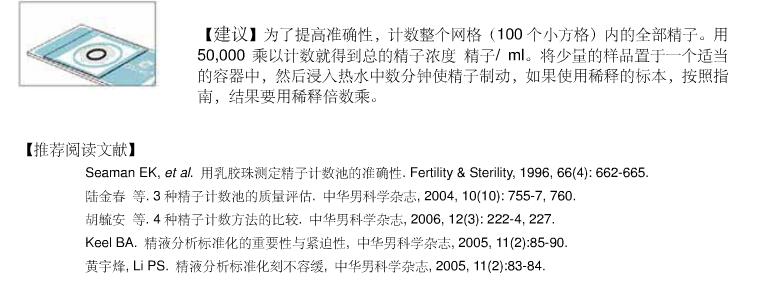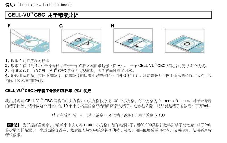 1、吸取之前彻底混匀样本 2、吸取1滴(约4ul)未稀释样品。样品置于一个点样区域的边缘(图F)。 一个CELL-VU® CBC载玻片可完成2个测试。 3、保证盖玻片上的CELL-VU® CBC字样面向观察者,因为背面蚀刻了网格。 4、轻轻地从样品上方压下盖玻片,使盖玻片的边缘刚好盖住样品(图G和H)。 滑动盖玻片至图I所示的位置。这样可以消除计数区域内的气泡。 CELL-VU® CBC用于精子计数和存活率(%)测定 找出并观察CELL-VU® CBC网格的中央方格。中央方格被分成100个小方格,每个方格为0.1 mm x 0.1 mm。对于未稀释的精子计数,请计数这个网格中的10个小方格里的部活动和不活动精子。总数被2除,结果就是精子的浓度:百万/ml。 精子存活率 %:= (精子浓度 - 不动精子浓度)/ 精子浓度 x 100. 建议: 为了提高准确度,计数整个中央方格(100个小方格)内的部精子。用50,000乘以计数得到精子总浓度:精子/ml。将少量的样品置于一个适当的容器中,然后浸入热水中数分钟可使精子制动。如果使用稀释的标本,按照指南,结果要用稀释倍数乘。 |