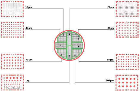 每个盖玻片上有八个区域,其特征是宽度(凹槽)或直径(圆孔)不同:从10μm到100μm。