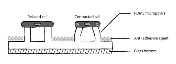 通过测量PDMS微柱响应于细胞施加的力的挠度来进行力评估。