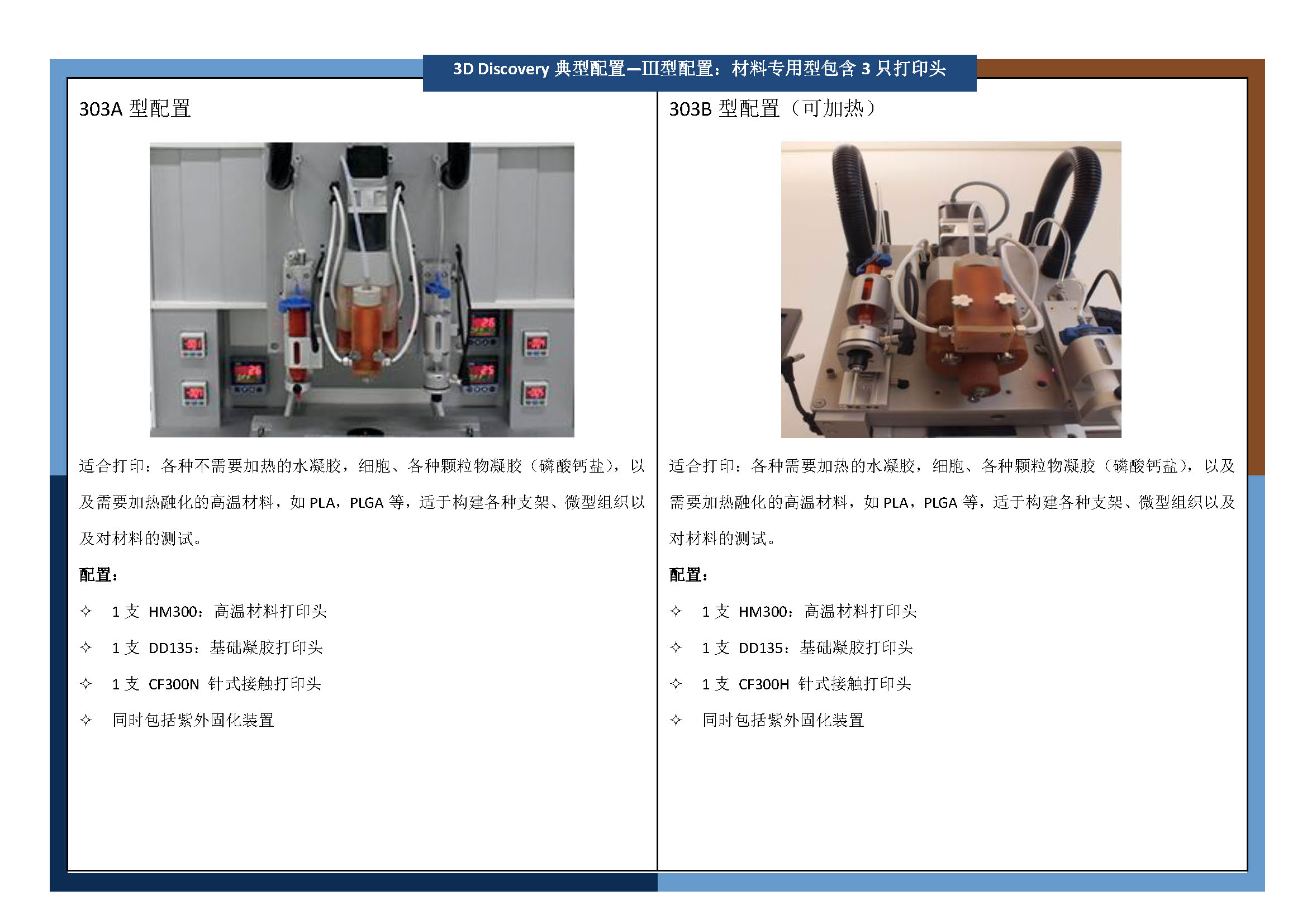 如胚胎干细胞(Embryonic stem cell)、脂肪干细胞(Adipose derived stem cell)、骨髓间充质干细胞(Bone marrow stem cell)、肝细胞(Liver cells)、肿瘤细胞(Tumor cell) DD135打印头主要适合于骨组织修复和再生材料的高粘度材料打印: 如羟基磷灰石(Hydroxyapatite)、磷酸三钙(Tricalcium phosphate)、珍珠质(Nacre) CF300N/ CF300H以及DD135均适合于软组织支架材料的打印: 如明胶(Gelatine)、藻朊酸盐(Alginate)、纤维蛋白(Fibrin)、胶原(Collagen)、琼脂(Agar)、聚氨基葡萄糖(Chitosan) HM300H主要适合于可加热材料的打印: 如聚乳酸(PLA)、乳酸-羟基乙酸共聚物(PLGA)、聚乙酸内脂(PCL)、羟基乙酸淀粉钠(Sodium Starch Glycolate),包括硅酮 (Silicones)、聚氨酯(Polyurethane)等 可升级 MESW静电纺丝打印头合适于超细纤维支架网络和水凝胶的结合(使用非常细的纤维组成的网络来加固软凝胶)的打印 静电纺丝技术和3D生物打印相结合,可以将超细纤维支架和水凝胶的结合起来,由此生物打印而成的三维结构wu论是刚度和弹 性都类似于人类自然生长 可升级2C-PH两组分细胞友好型打印头合适多种材料的打印 可以使2个加料仓公用一个打印头,可以一次性多种加料,减少因换料引起的污染