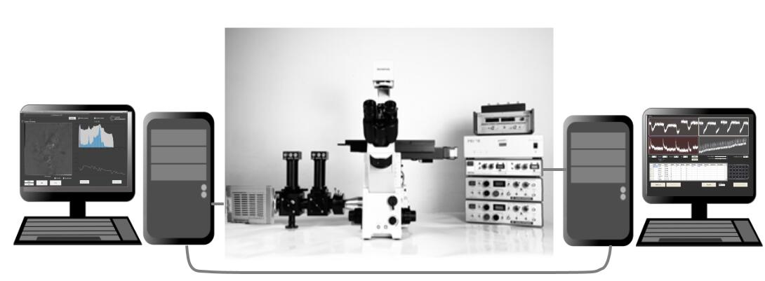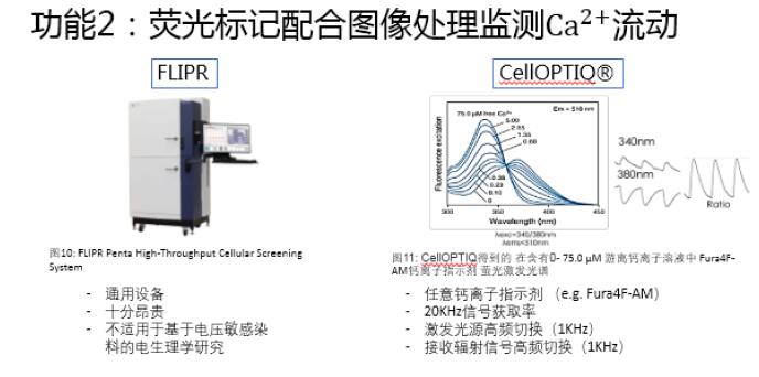 功能特点2:荧光标记配合图像处理监测Ca2+流动 该系统更灵活 实惠: - 可适用于任意钙离子指示剂 (e.g. Fura4F-AM) - 20KHz信号获取率 - 激发光源高速切换(1KHz) - 辐射信号获取高速切换(1KHz)