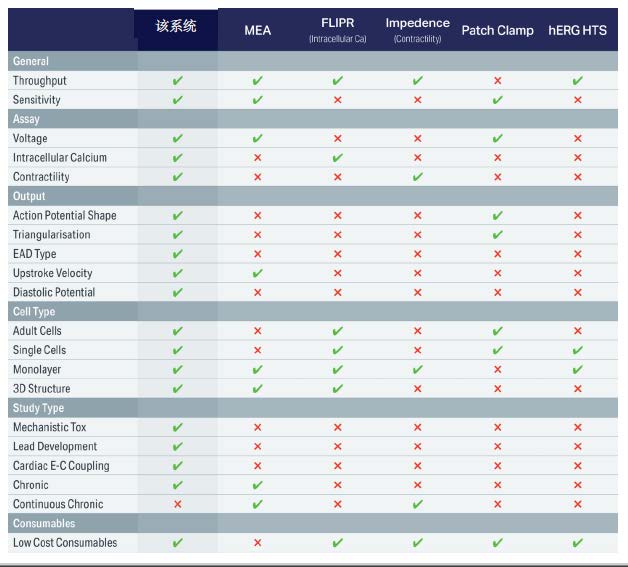 该系统与其他检测方法的比较优势: 与其他测定法的比较能够清楚地看到,该系统具有更高的敏感性。通过单一实验,就可以为客户提供对更广泛的细胞类型和研究方案的du立电压、钙瞬态和收缩力实验中产生的数据。
