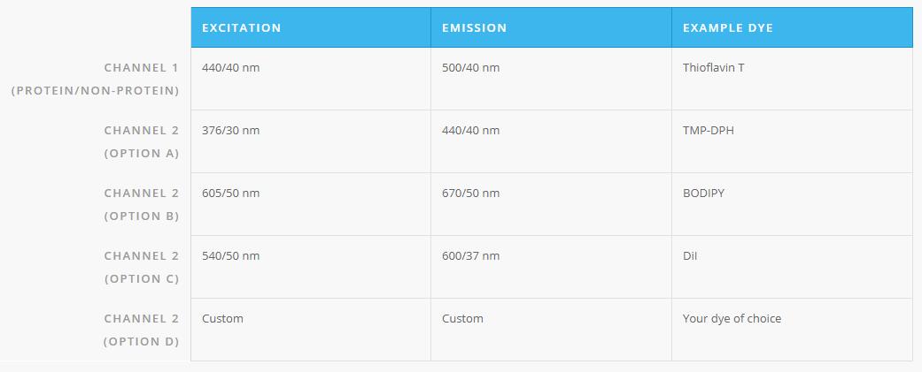 获得确定配方中其他颗粒所需的灵活性。 在TMA,Bodipy,DiI的通道之间进行选择,以识别疏水性实体或特定于您的过程的其他分子。 看不到您想要的频道吗? 选择您自己的自定义激发和发射!