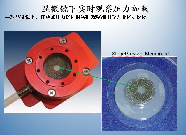使用FX-5000压力加载系统对细胞进行压力加载。 使用标准正立式显微镜实时观察细胞在切应力下的反应。 样品培养在StagePresser硅胶模,放在活塞和固定台之间接受压力加载。 StagePresser: StagePresser装置 三个丙烯酸活塞和特制StagePresser硅胶模 需要标准正立式显微镜和光源观察细胞 StagePresser硅胶模 StagePresser Membranes: