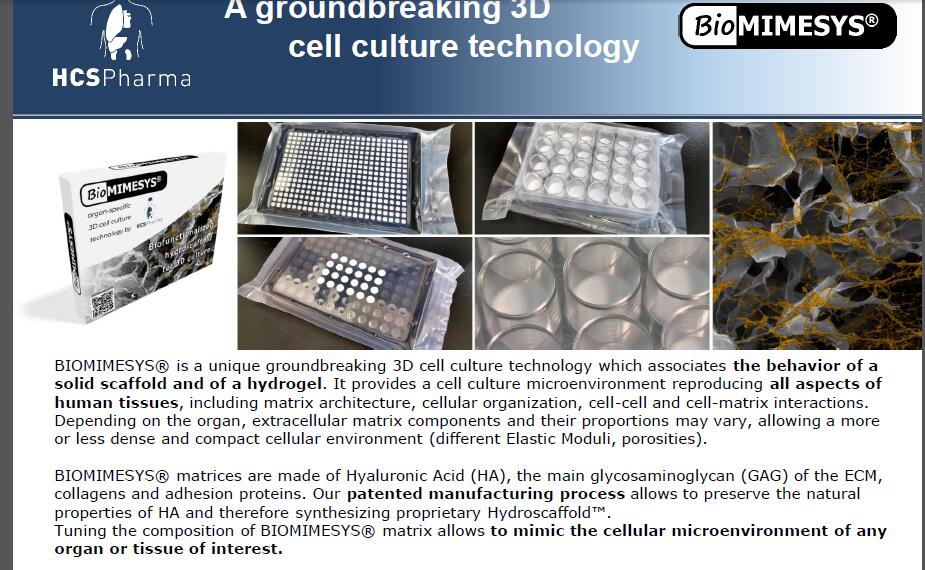 BIOMIMESYS®是一项du特的突破性3D细胞培养技术,它结合了固体支架和水凝胶的行为,从而提供了可复制人体组织各个方面的细胞培养微环境,包括基质结构,细胞组织,细胞-细胞和细胞-基质相互作用 。