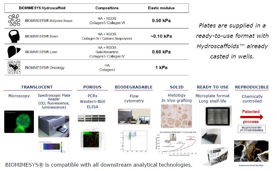 BIOMIMESYS® is a unique groundbreaking 3D cell culture technology which associates the behavior of a solid scaffold and of a hydrogel which provide a cell culture microenvironment reproducing all aspects of human tissues, including matrix architecture, cellular organization, cell-cell and cell-matrix interactions.