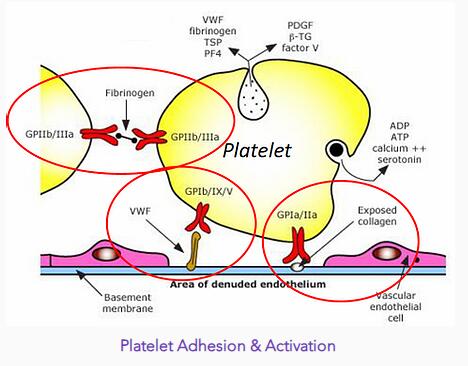 粘附:血小板粘附在损伤部位周围。 暴露的胶原蛋白和 VWF 分别通过 GPIa/IIa 和 GPIb/IX/V 受体将血小板锚定在内皮下。