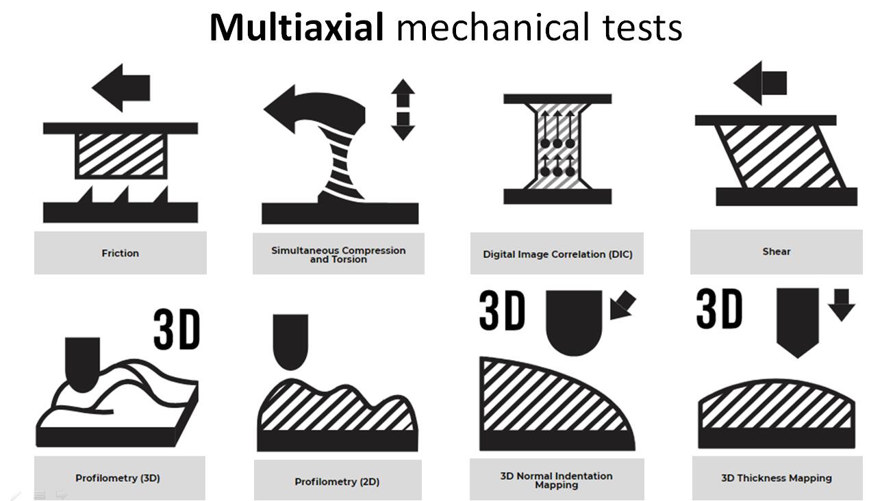 Integrated tension, infinite compression, finite compression, shear, friction, 3D Indentation mapping (irregular surface), 2D contour, 3D contour mapping (irregular surface), 3D thickness mapping, torsion, three-point bending, four-point bending, cantilever bending, puncture force, tear, fracture, viscosity (adhesive), blasting force, stripping force, impact force, injection pressure and suction, swelling and shrinkage, lap shear force and other mechanical types, mechanical electrical testing (compression and simultaneous measurement of potential) and a multifunctional device for testing and analyzing the micromechanics and potential characteristics of biological tissue materials coupled with various forces.