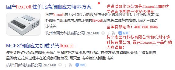 世联博研(北京)科技有限公司强烈建议尽快删除杭州表面力科技有限公司、杭州轩辕科技有限公司和大连板桥科技有限公司三家公司冒充美国flexercell细胞应力加载系统等产品虚假宣传广告,并保留对杭州表面力科技有限公司、杭州轩辕科技有限公司和大连板桥科技有限公司三家法律追责权利。 世联博研(北京)科技有限公司