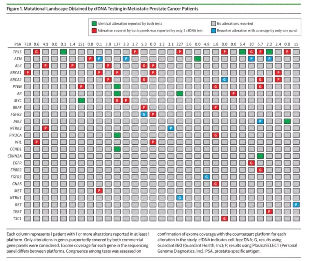 研究人员招募了40名患转移性前列腺癌的患者,抽取了血样后,分成两份分别送到两家的实验室进行测序。在这40例样本中有6例因为某些原因检测结果被认定无效,剩下的34例中,有12例(35%)检测报告给出的结果相同,其中有3例突变谱完全一致,其余9例均没有检测到突变。剩下的22名患者就没这么“好的运气”了,他们中有6例检测到的突变有重合,但是又不完全相同,还有16例检测到的突变完全不重合。